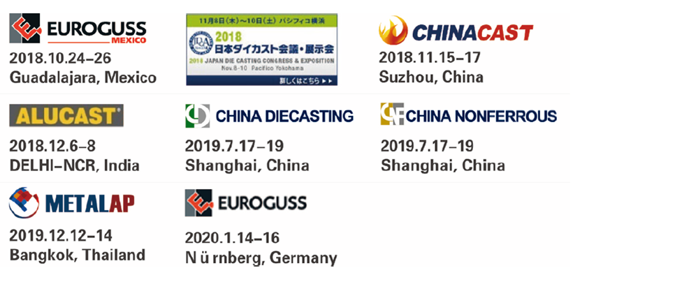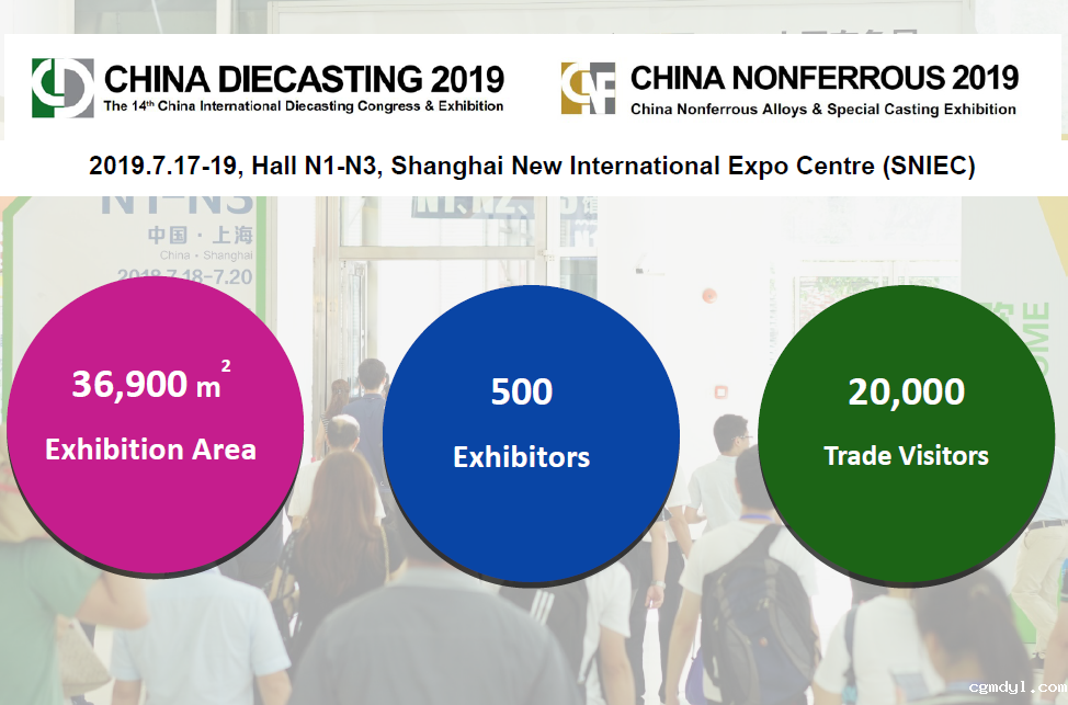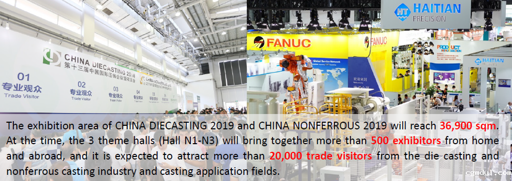 CHINA DIECASTING 2019 and CHINA NONFERROUS 2019 will bring together die casting foundries and their equipment suppliers, material suppliers, accessories as well as service providers, including die casting machines and plants, low pressure machines, counter-pressure machines, peripheral devices and systems, furnaces and accessories, after treatment of castings/CNC treatment, heat treatment and surface technology, molds and accessories, raw and auxiliary materials, quality assurance/control, simulation software, rapid prototyping/rapid tooling, etc.