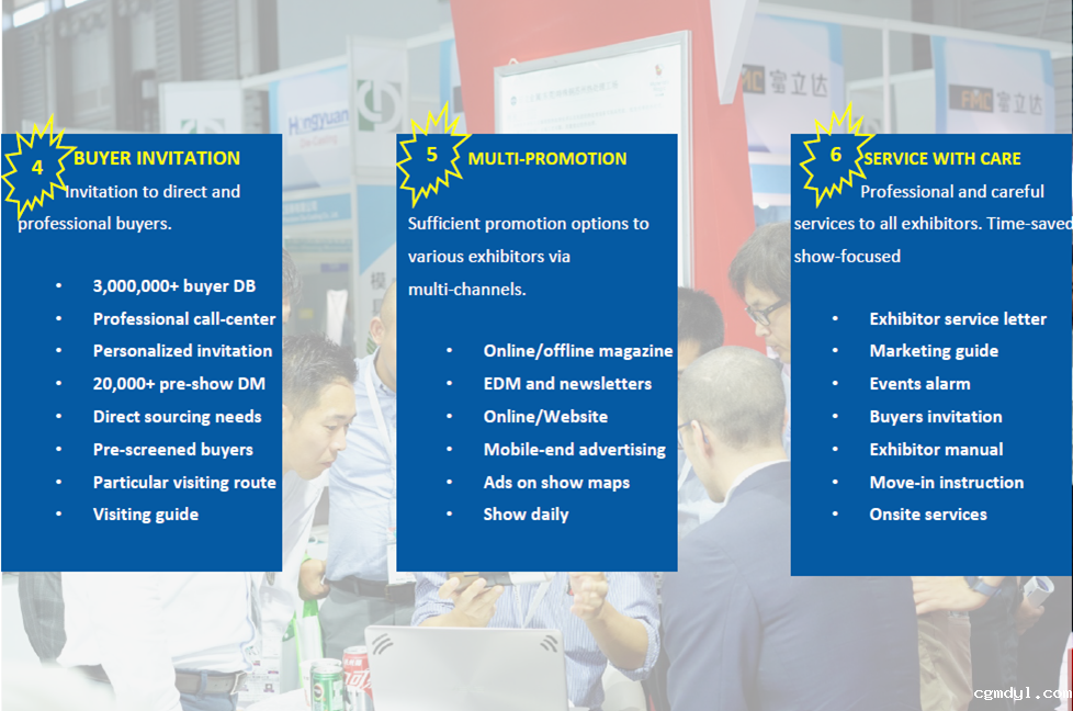 Professional service models, such as exhibitor service letter, marketing brochure, exhibitor manual, one-to-one personal service, event reminder, onsite construction support, onsite exhibitor service, will save the time and cost for exhibitors, help you to focus on the exhibition.